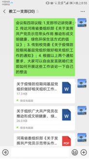 两个教工党支部和两个学生党支部于3月23日至27日也分别召开党员大会,以学习强国会议形式开展了支部书记讲党课活动。党课结束后,各支部书记还分别领学了省委组织部《关于发挥共产党员示范带头作用 推动形成文明健康、绿色环保生活方式的倡议》并对疫情期间,深化支部“两化一创”、持续开展党员个人学习充电、党费缴纳等事宜进行安排和部署。
