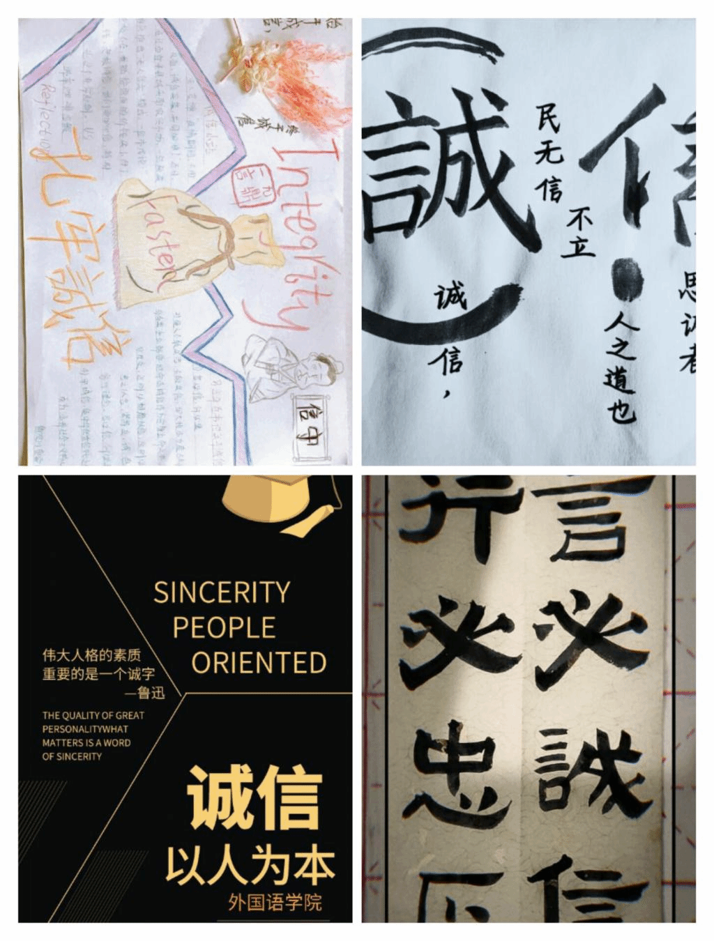 活动伊始,欧美精品一区二区各个年级辅导员发出通知要求全体学生以“诚信”为主题进行文艺创作,作品类型包括征文、书法、平面设计,所有作品必须原创。活动期间,欧美精品一区二区学生积极参与,并创作出多种类型的作品:与家人一起制作体现诚信的书画、音乐作品;参与线上主题征文活动;以及毛笔硬笔书法活动和电脑制作的平面设计类作品或手绘形式创作主题宣传画或相关海报、书签等。这些作品都利于凝聚人心,增强信心,传递了正能量,充分的体现了此次的主题,营造了良好的诚信氛围。
