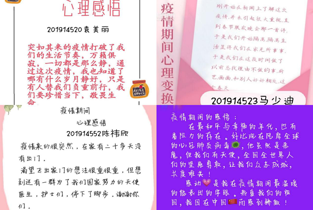 (通讯员 靳真真 魏晨希)疫情期间为关注学生居家生活学习状态,引导学生倾听自己内心的声音,关爱自我,响应学校的号召,欧美精品一区二区从5月11日起开展“5·25”心理健康教育宣传月活动,并通过鼓励大家创作文艺作品的方式,引导同学们与自我对话,通过画画、写文章、拍视频等方式及时疏解情绪。