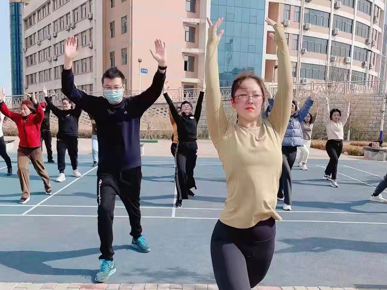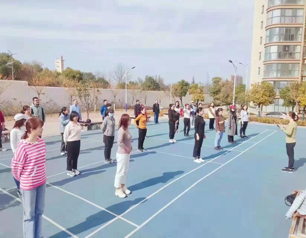 伴随着舒缓的音乐,教职工们时而曲腿,时而展臂,时而弯腰,跟着葛婧老师进行瑜伽系统培训。