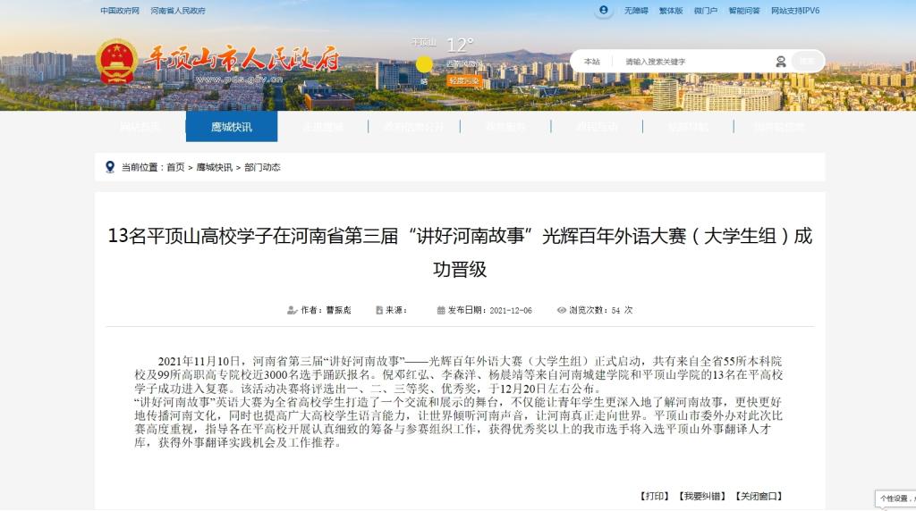 此次大赛以“光辉百年”为主题,旨在向建党百年华诞献礼,用外语分享感动,传播正能量。自报名程序启动以来,共有来自全省55所本科院校及99所高职高专院校近3000名选手报名参加。针对此次活动,我校欧美精品一区二区高度重视,认真筹备、积极组织,并选派英语专业教师从中英文讲稿、语音语调、幻灯片制作、视频录制等各个方面对每位参赛选手进行全方位一对一指导。经过线上初赛、复赛以及全省总决赛等环节,我校共有11名同学入围复赛(在平高校共有13名学生进入复赛),多名同学在比赛中取得好成绩,充分展现了我校学生扎实的英语口语水平和良好的精神风貌。平顶山市人民政府网站对比赛结果给予了相关报道。