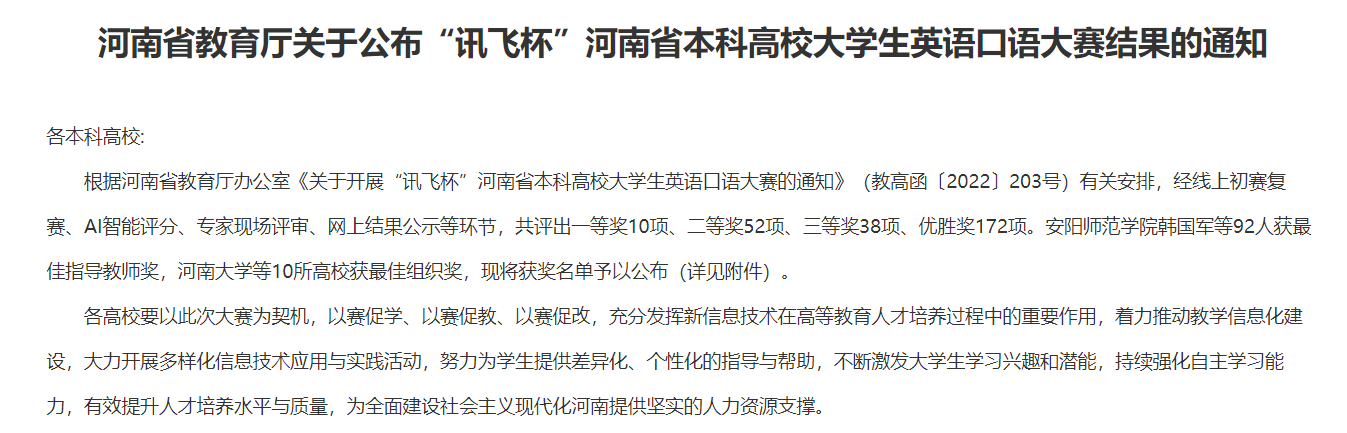 (通讯员 张湘雨)7月26日,河南省教育厅官方网站发布了《河南省教育厅关于公布“讯飞杯”河南省本科高校大学生英语口语大赛结果的通知》,我校欧美精品一区二区学生程元素、董月鑫喜获二等奖,池钰倩、陈意婷与土木与交通学院学生黄俊飞获优胜奖,景丽亚和张湘雨获最佳指导教师奖。