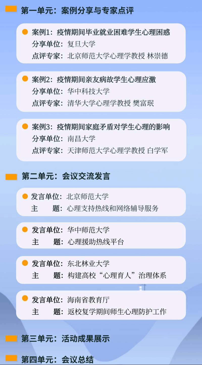 本次学习会议分为四个单元。第一个单元为案例分享与专家点评。复旦大学、华中科技大学和南昌大学的心理老师对疫情期间典型心理案例进行分析,北京师范大学林崇德教授、清华大学樊富珉教授和天津师范大学白学军教授就此进行精彩的点评。第二单元为会议交流发言,北京师范大学、华中师范大学、东北林业大学和海南省教育厅进行了主题发言,总结近期工作。第三单元为活动成果展示,用视频展示各高校疫情发生以来所做出的优秀成果。第四部分为会议总结,教育部思政司副司长张文斌进行了总结发言,对疫情发生以来的各学校的工作进行了总结,同时对疫情防控常态化背景下心理健康工作进行再部署。