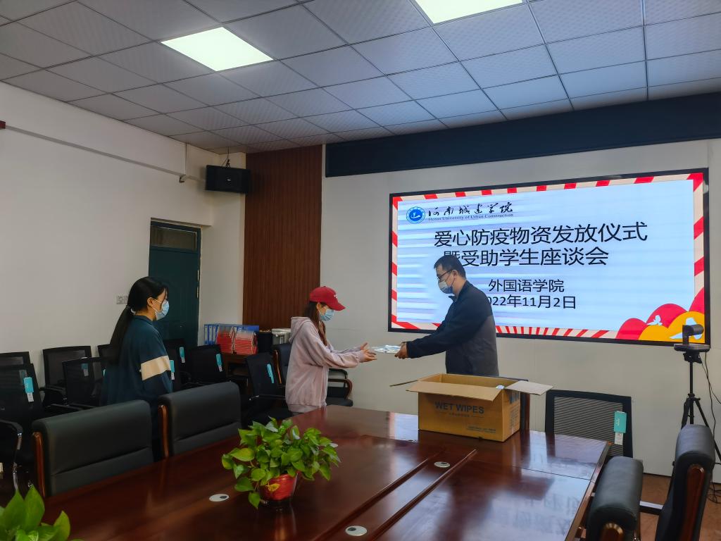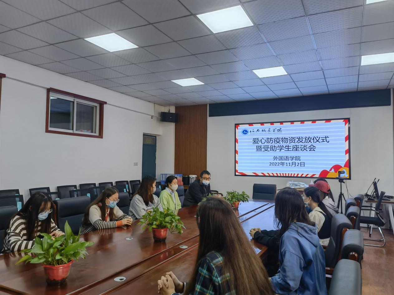 (通讯员:于瑞雪)为进一步落实我校资助政策,传递学校及学院对家庭经济困难学生的关爱,保障疫情防控期间困难学生做好自我防护,欧美精品一区二区于11月2日下午在会议室举办了爱心防疫物资发放仪式暨受助学生座谈会。学院党委副书记胡思博、部分辅导员老师及受助学生代表参加了本次活动。
