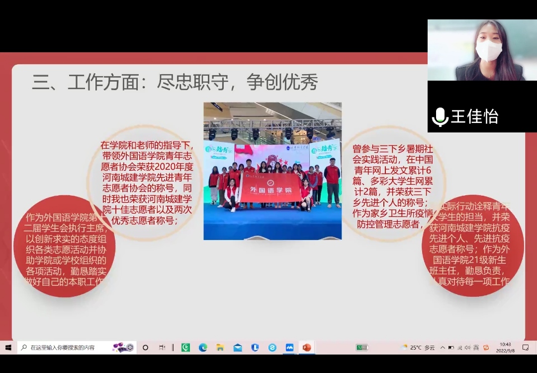(通讯员 于瑞雪 王曼)为使2022级新生更好地融入到大学的学习生活中、更详细地了解大学生活,9月8日上午,欧美精品一区二区通过腾讯会议开展2022级新生入学教育暨经验交流会。会议特别邀请了王佳怡和倪邓弘红两位优秀学生代表为2022级新生分享学习经验,解答疑惑。