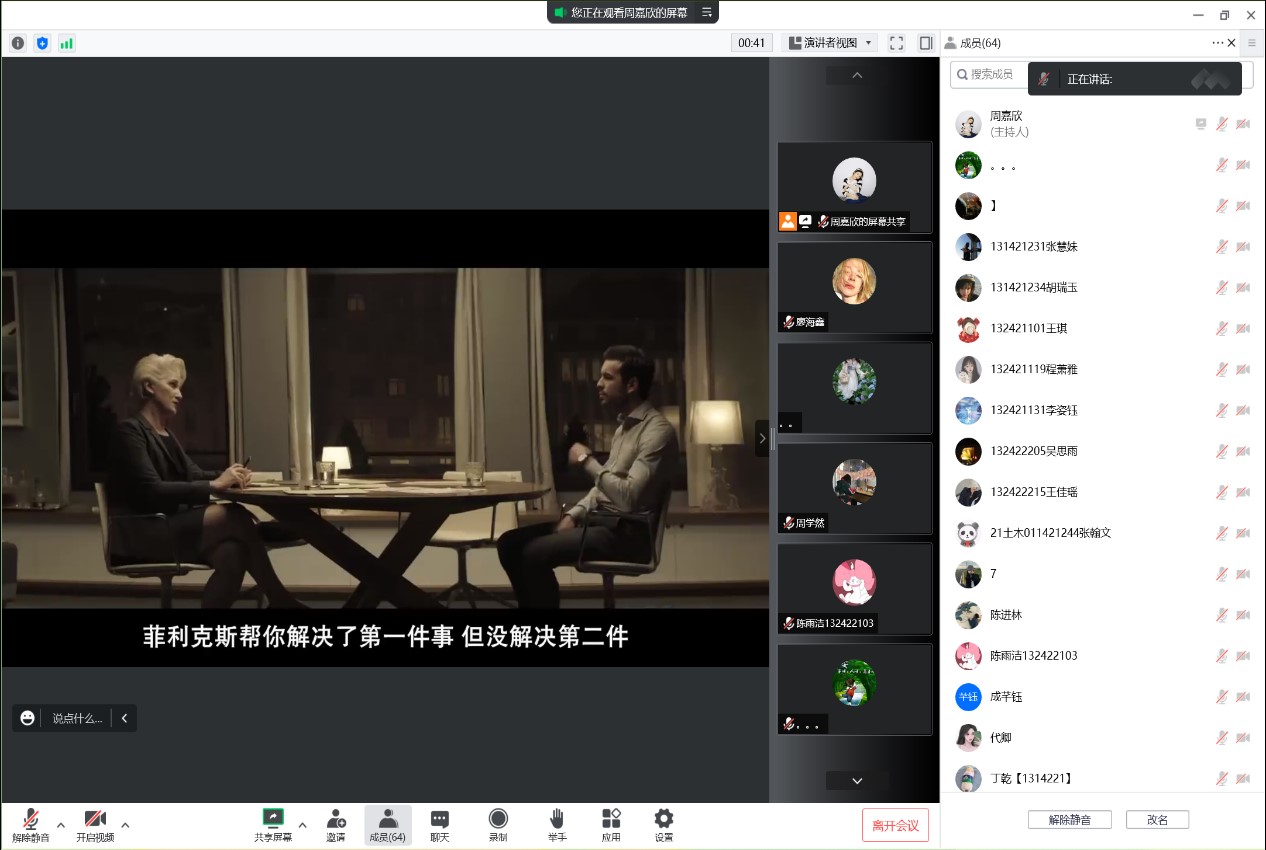 此次电影的放映由同学们进行投票,选出大家最心仪的电影,最终投票决定放映《看不见的客人》。这部电影主要讲述了一位企业家在事业如日中天之时被卷入一桩谋杀案中,为了洗脱罪名,他请来了金牌女律师为自己辩护的故事。电影还未开始许多同学就进入腾讯会议等待电影的放映,可见大家对此次活动都非常期待。而在电影播放的过程中,很多同学都在评论区里讨论剧情的走向,分析主人公处在当时环境下的内心活动,这也就使得大家都参与到活动中来。