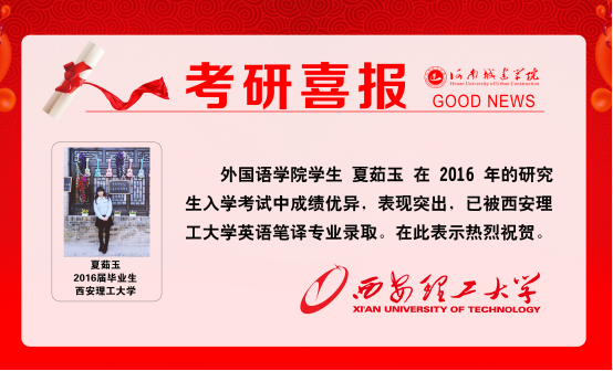 欧美精品一区二区近年来高度重视学生的考研工作,随着2016年研究生招生复试工作的陆续展开,我院学生被国内外高校录取的捷报频频传来。据悉,夏茹玉同学已成功被西安理工大学英语笔译专业录取,并获得笔试第七,复试后总成绩第五的好成绩。
