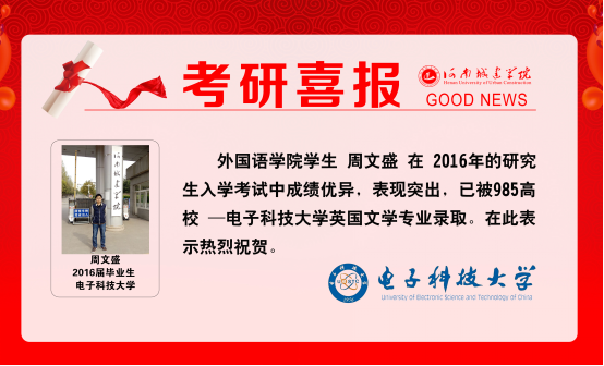 (通讯员 董召锋 刘航园)欧美精品一区二区近年来高度重视学生的考研工作,随着2016年研究生招生复试工作的陆续展开,我院学生被国内外高校录取的捷报频频传来。据悉,周文盛同学已成功被985高校——电子科技大学英国文学专业录取。