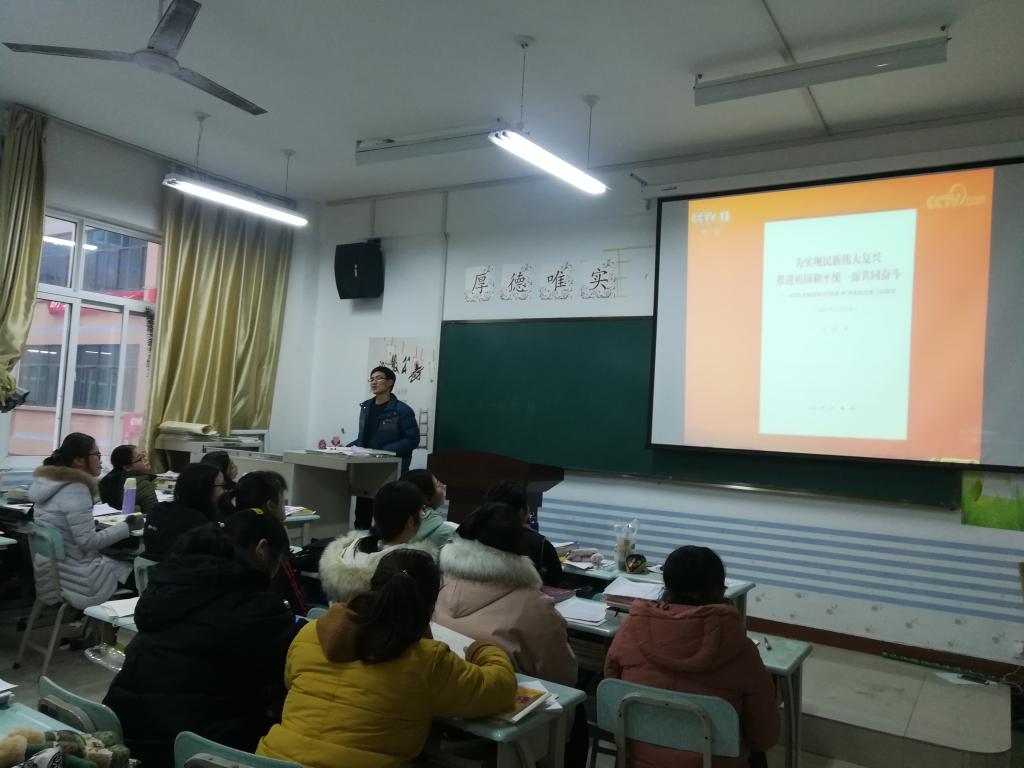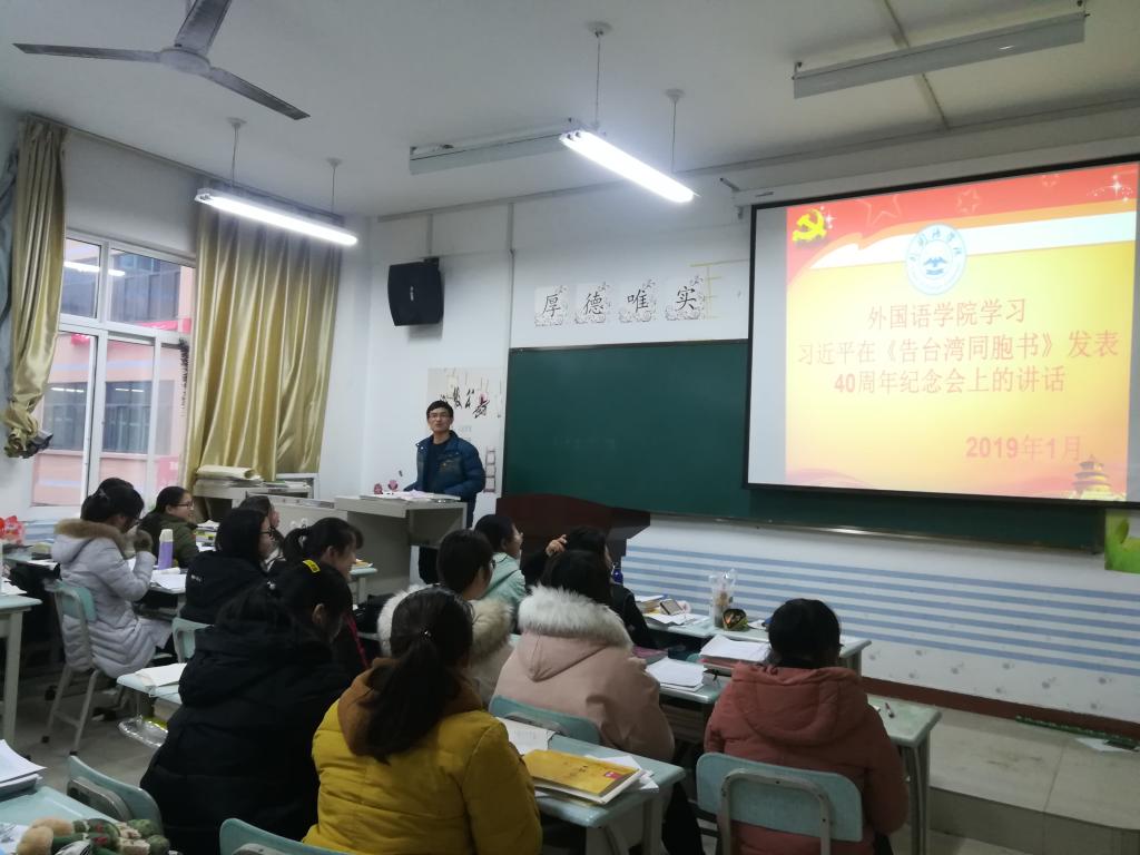 (通讯员:赵星辰)为贯彻落实习近平新时代中国特色社会主义思想体系,厚植新时代大学生的爱国主义情怀,增强道路自信和制度自信,欧美精品一区二区于2019年1月10日在一号教学楼304教室学习习近平在《告台湾同胞书》发表40周年纪念会上的讲话:《为实现民族伟大复兴 推进祖国和平统一而共同奋斗》,班会由辅导员赵星辰老师主持,大二全体学生参加。