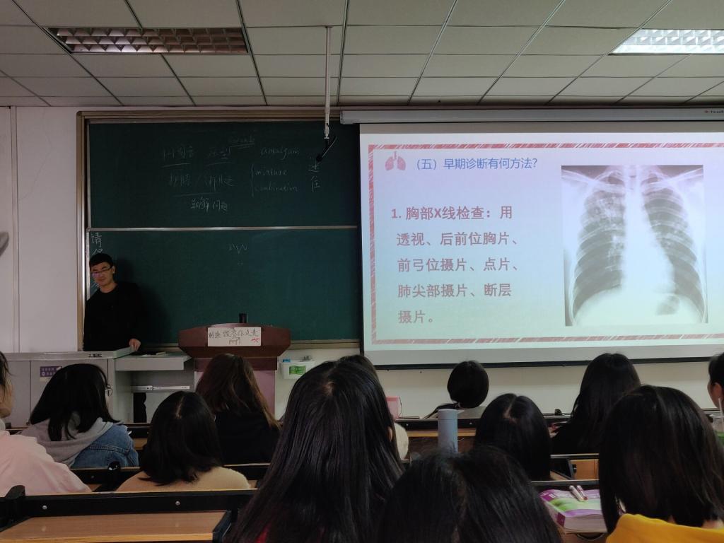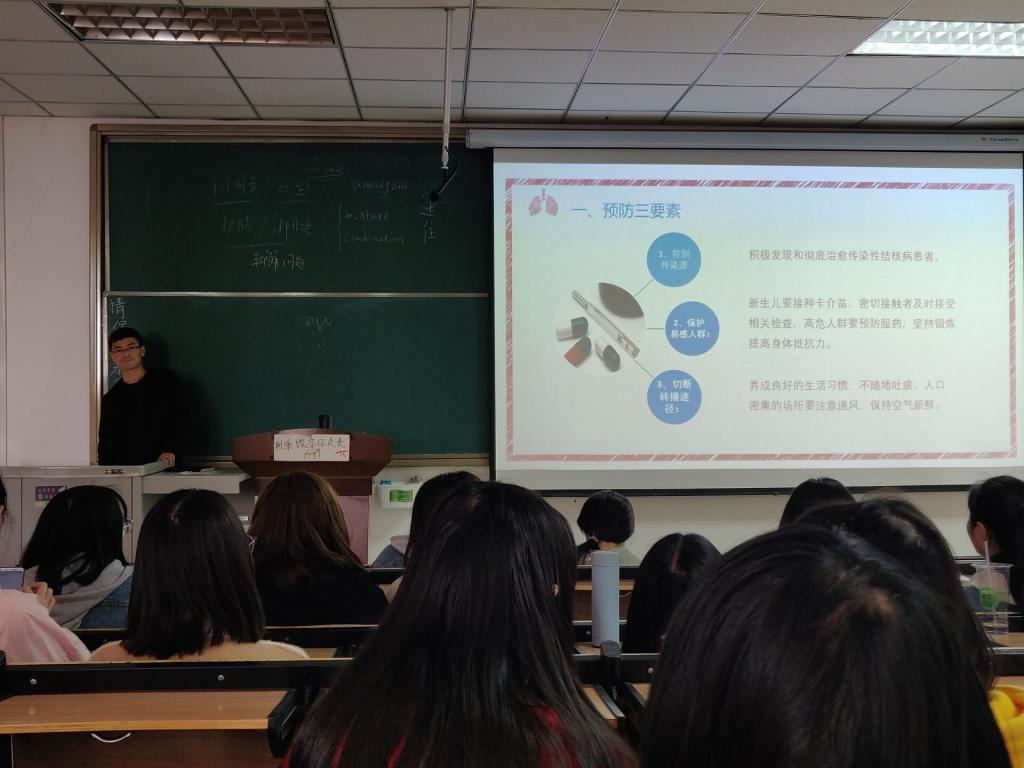 班会主要讲解了“世界防治结核病日”的来源、主题、结核病的概念、结核病的历史、现状和发展趋势、我国结核病现状、结核病的传染途径、结核病的易感染人群、结核病的治疗途径、结核病的药物治疗、我国结核病专业治疗机构、国家针对肺结核诊断和治疗的免费政策、新时代大学生的预防措施。
