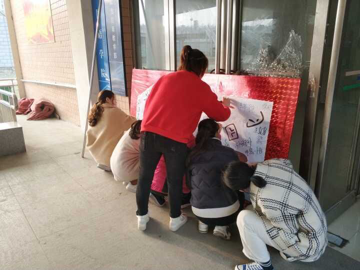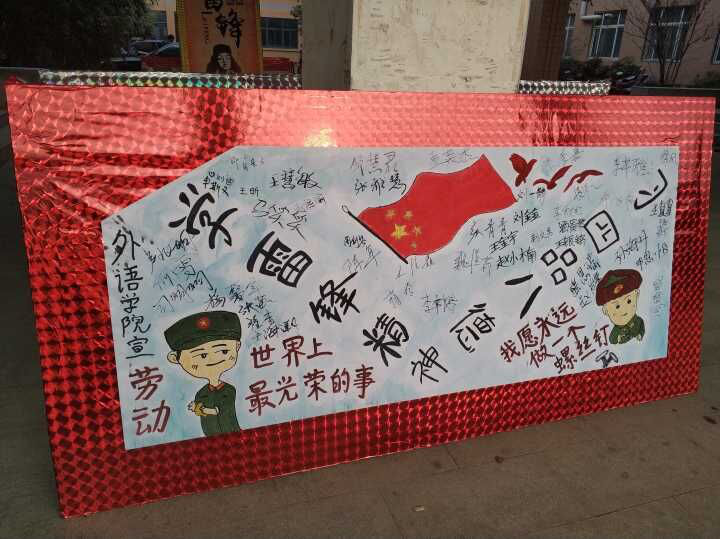 活动伊始,青年志愿者把雷锋月的宣传海报放到文管校区教学楼一楼入口处,海报上有两个雷锋的动漫画像以及号召向雷锋同志学习的宣传标语和一面鲜艳的五星红旗,彰显了雷锋精神与每个学生的密切联系。随后大家在海报上踊跃签名,以示同学们对弘扬雷锋精神的重视和敬仰之情。最后志愿者们戴上小红帽,全体集合,雷锋月活动正式开启。