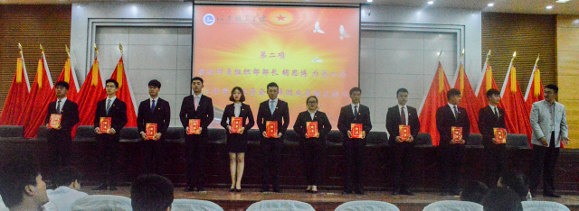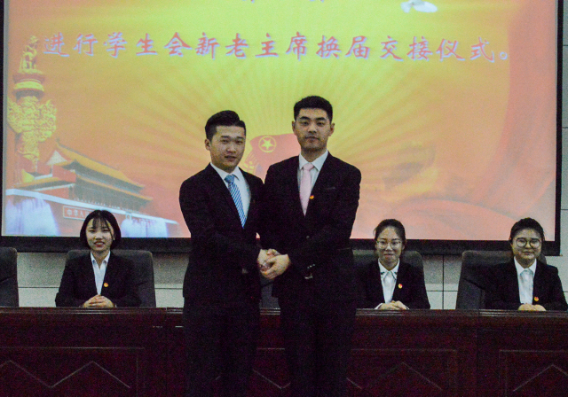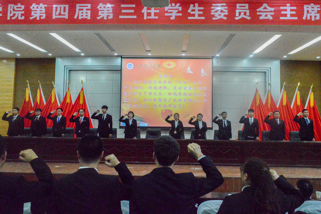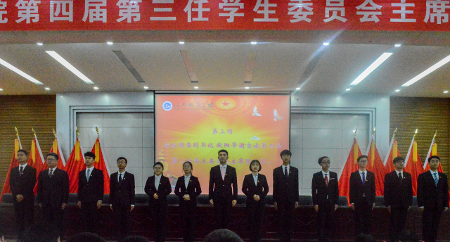 伴随着激昂的国歌,大会正式开始。校团委胡思博老师为第四届第二任学生委员会主席团成员颁发聘书,充分肯定了去年一年的成绩并对大家表示了衷心的感谢。随后,校团委副书记欧阳华澎宣读第四届第三任学生委员会主席团名单并对学生会工作提出了殷切期望,鼓励大家撸起袖子加油干。学生会新老主席换届仪式后,第四届第三任学生会主席吴耀辉作就职报告,对新工作、新任务进行了展望,并带领学生会成员进行宣誓,表示一定不忘初心,继续前行。最后,校团委副书记赵笑声为本次大会致闭幕辞。