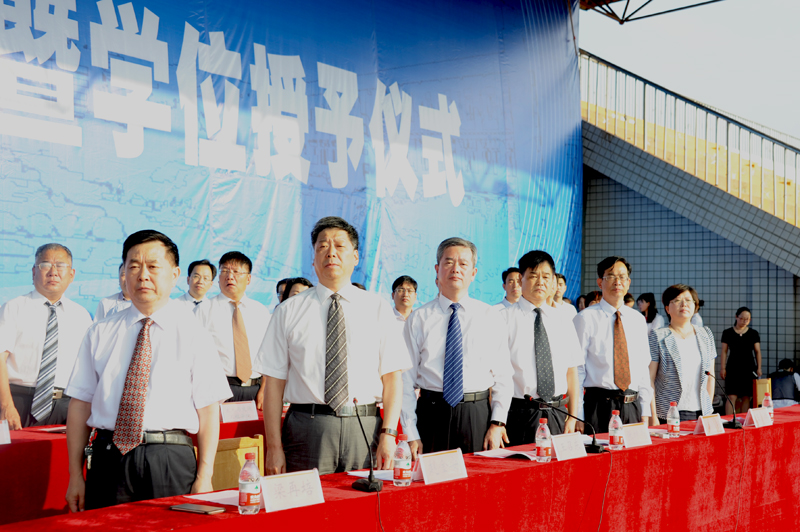 典礼在庄严雄壮的国歌声中拉开帷幕。校长王召东为109名本科毕业生代表拨苏正冠、颁发学位证书并合影留念。