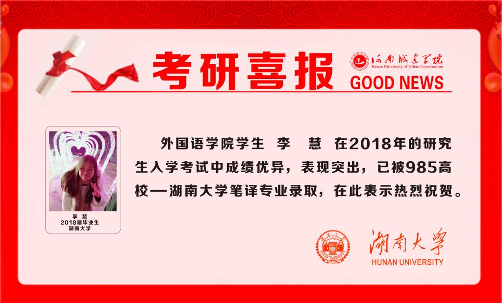 (通讯员:张枭枭)欧美精品一区二区近年来高度重视学生的考研工作,随着2018年研究生招生复试工作的陆续展开,我院学生被国内外高校录取的捷报频频传来。据悉,李慧同学已被湖南大学英语笔译专业录取,笔试排名第7,面试排名第2,成功实现人生梦想。