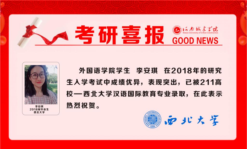 (通讯员:张枭枭)欧美精品一区二区近年来高度重视学生的考研工作,随着2018年研究生招生复试工作的陆续展开,我院学生被国内外高校录取的捷报频频传来。据悉,李安琪同学已被211工程学校---西北大学汉语国际教育专业录取。