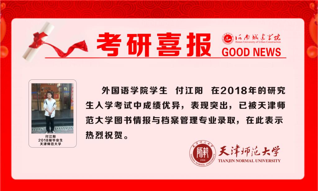 (通讯员:张枭枭)欧美精品一区二区近年来高度重视学生的考研工作,随着2018年研究生招生复试工作的陆续展开,我院学生被国内外高校录取的捷报频频传来。据悉,付江阳同学已成功被天津师范大学图书情报与档案管理专业录取。