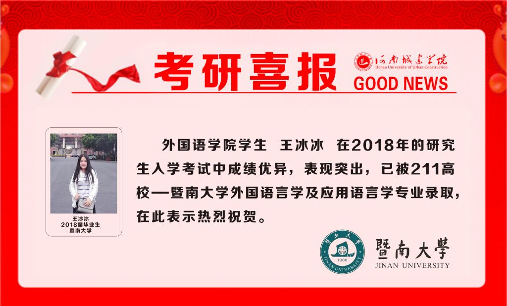 (通讯员:张枭枭)欧美精品一区二区近年来高度重视学生的考研工作,随着2018年研究生招生复试工作的陆续展开,我院学生被国内外高校录取的捷报频频传来。据悉,王冰冰同学已被211工程学校---暨南大学外国语言学及应用语言学专业录取,并获取综合排名第7的优异成绩。