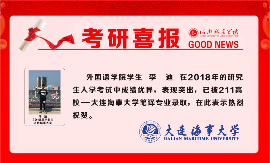 2018年研究生招生复试工作的陆续展开,我院学生被国内外高校录取的捷报频频传来。据悉,李迪同学已成功被大连海事大学笔译专业录取。