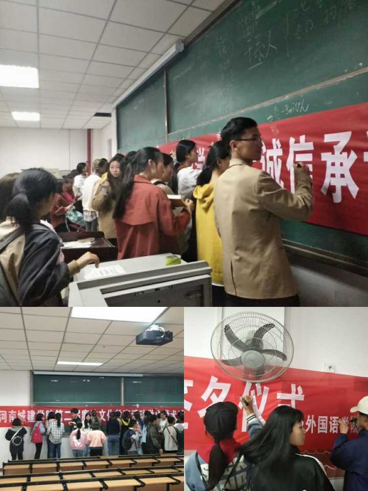 活动当天,学院志愿者在326教室将横幅悬挂起来并准备好黑色笔。9点30分活动正式开始,我院学生有序来到326教室进行签名,志愿者积极宣传诚信在大学生活、考试和交友中的重要性。活动结束后,同学们纷纷表示:诚信不仅是传统美德,更是做人准则,今后一定要诚信做人、诚信做事、诚信考试、诚信生活。