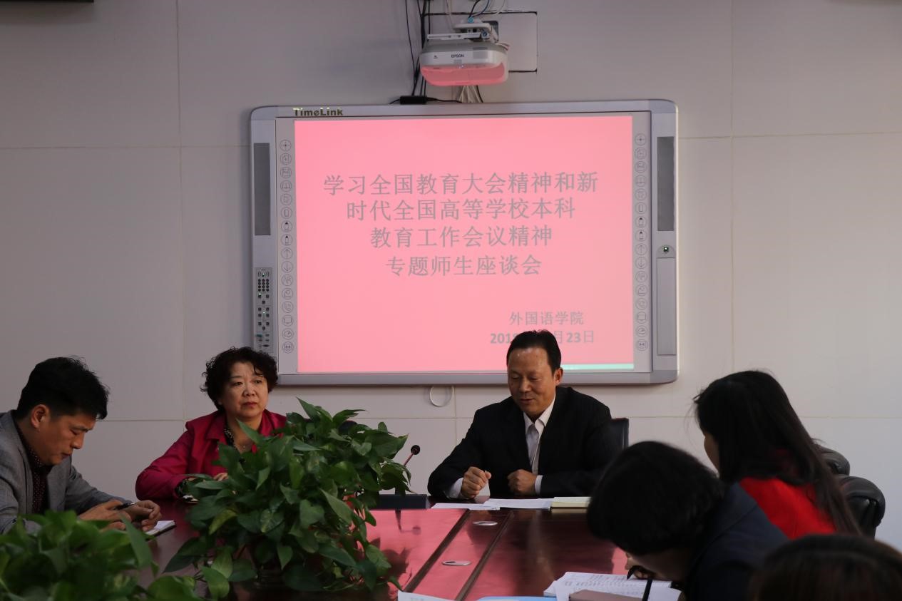会议伊始,秦平新院长就全国教育大会精神和新时代全国高等学校本科教育工作会议精神向参会师生做了传达,并强调这两次教育会议是国家改革开放40年来对高等学校本科教育而言具有重大意义的会议。随后,他鼓励师生结合自身实际畅谈此次会议精神学习后的感想。其中,教师代表主要从教师教的角度提出这次会议提倡的利用多种媒体教学手段实行“线上线下”混合式教学非常符合现在学生的学习需求,取消“清考”制度对于提高学生的学习积极性和主动性有很大的帮助,他们一致认为这两次教育大会的召开很及时。学生代表也做了积极发言,他们表示很认可给本科生增负增压的措施,认为这一举措可以督促他们学习,掌握扎实的专业知识能够为他们未来毕业后工作或考研打好基础。最后,秦平新院长做了总结发言,他强调,教师要在深入领会会议精神的基础上把教学质量提升到更高的水平,同时希望学生努力学好专业知识,未来成为新时代需要的高素质人才。