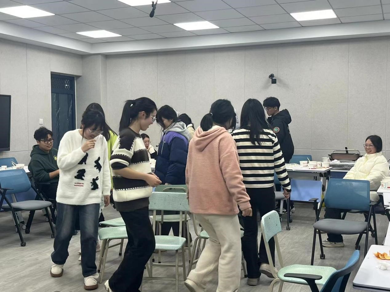 活动中,大家一起动手揉面、擀皮、包饺子,有分工有合作,各显身手,忙得不亦乐乎。大家一边包着饺子,一边畅谈冬至的习俗和趣事,一盘盘热腾腾的饺子端上了桌,驱散了冬日的严寒,现场欢声笑语、暖意融融。在吃过热腾腾的饺子后,罗孟阳老师组织大家开展击鼓传花以及抢凳子的游戏,拿到花以及没有抢到凳子的同学为大家表演才艺。在活动的最后,罗孟阳老师组织同学们合唱《灯火里的中国》,一起送上节气祝福,活动在同学们动听的歌声中落下帷幕。