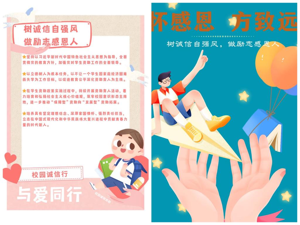 大赛以“树诚信自强风,做励志感恩人”为主题,参赛作品分为平面类和视频类,学生们在本次大赛中充分展现了自己的创意和才华,不仅将对资助政策的理解融入设计作品,而且深刻传达了倡导积极申请资助、感恩诚信、成长成才的意志态度。经学院评审,推选出平面类作品《怀感恩,方致远》《诚信受助,感恩励学》《诚信校园行》《感恩助学,公益共行》和视频类作品《助学 筑梦 铸人》《诚信受助,自立自强》共6个优秀作品参加学校比赛。