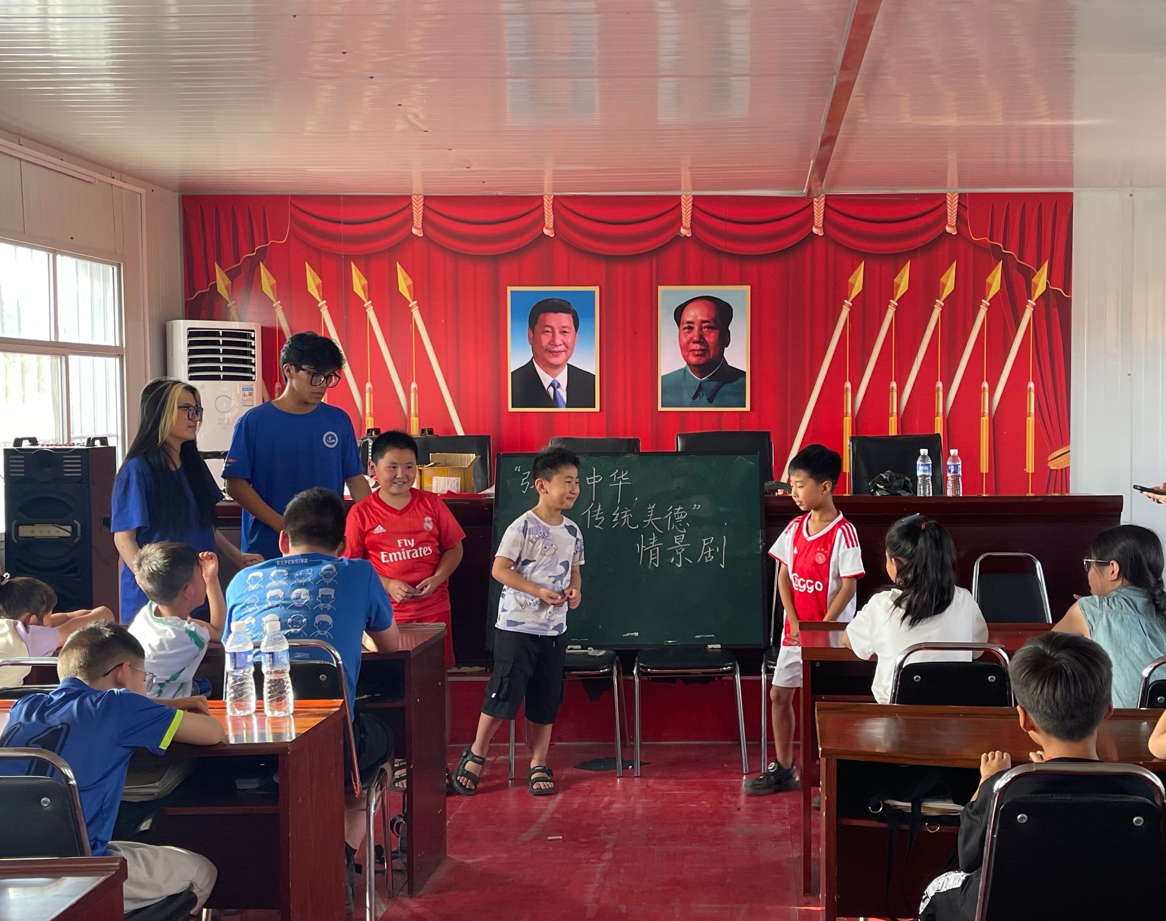 (实践团成员带领小朋友们开展“弘扬中华传统美德”情景剧)