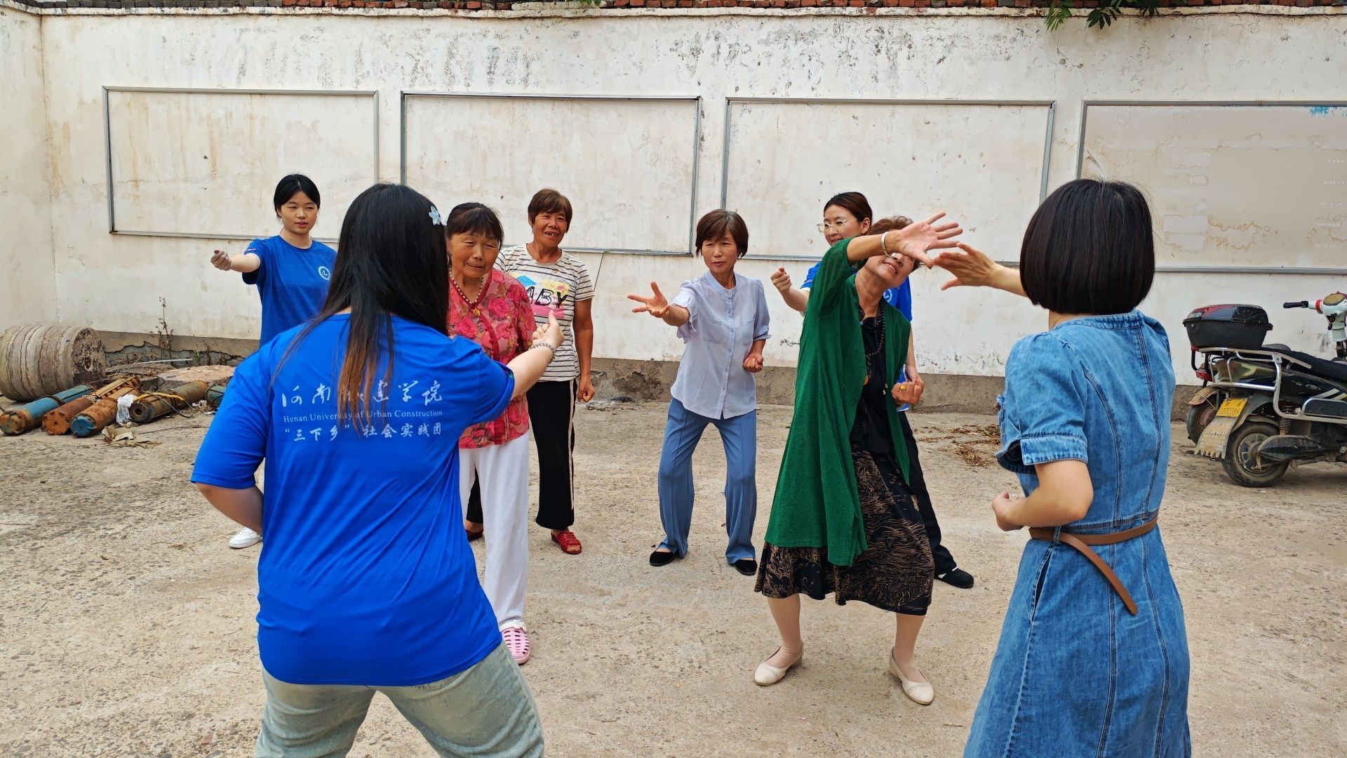 实践团首先在茨芭镇政府会议中心举行“三下乡”启动仪式,茨芭镇党委委员冯玉朋首先对实践团的到来表示热烈欢迎,希望实践团以此次“三下乡”社会实践活动为契机,牢记嘱托,发扬奋斗精神,在实践中受教育、长才干、做贡献。其次,团队走进茨芭镇中心小学开展防溺水安全教育,通过动画视频展播、真实案例剖析、互动问答竞猜等形式,生动普及“防溺水六不准”、溺水危害及科学自救施救知识。随后,团队走近河南省非物质文化遗产——庞庄二簧戏,现场欣赏后,队员教村民打“八段锦”,从基础手型步型教起,逐式分解动作要领,耐心纠正老人姿势。