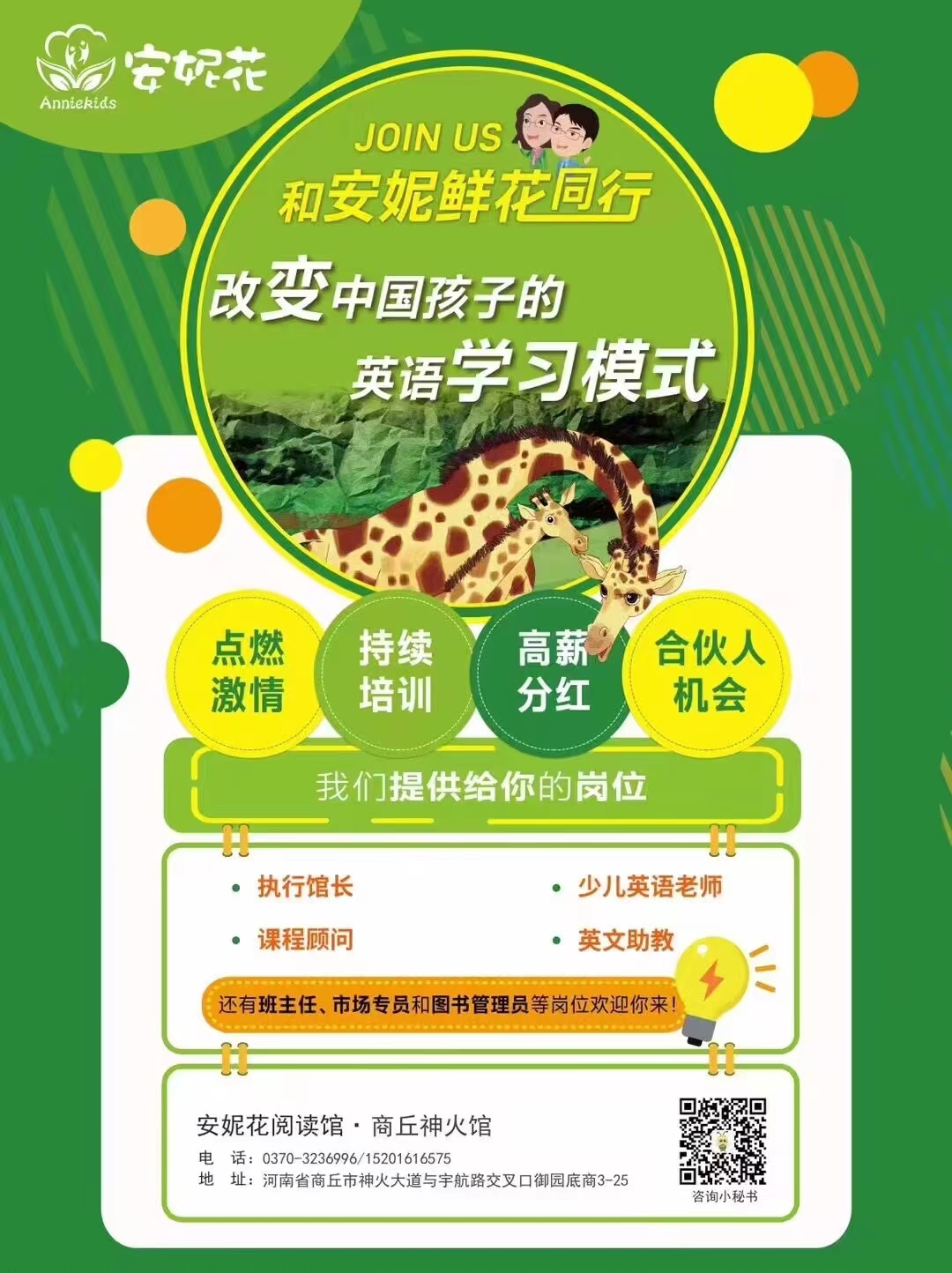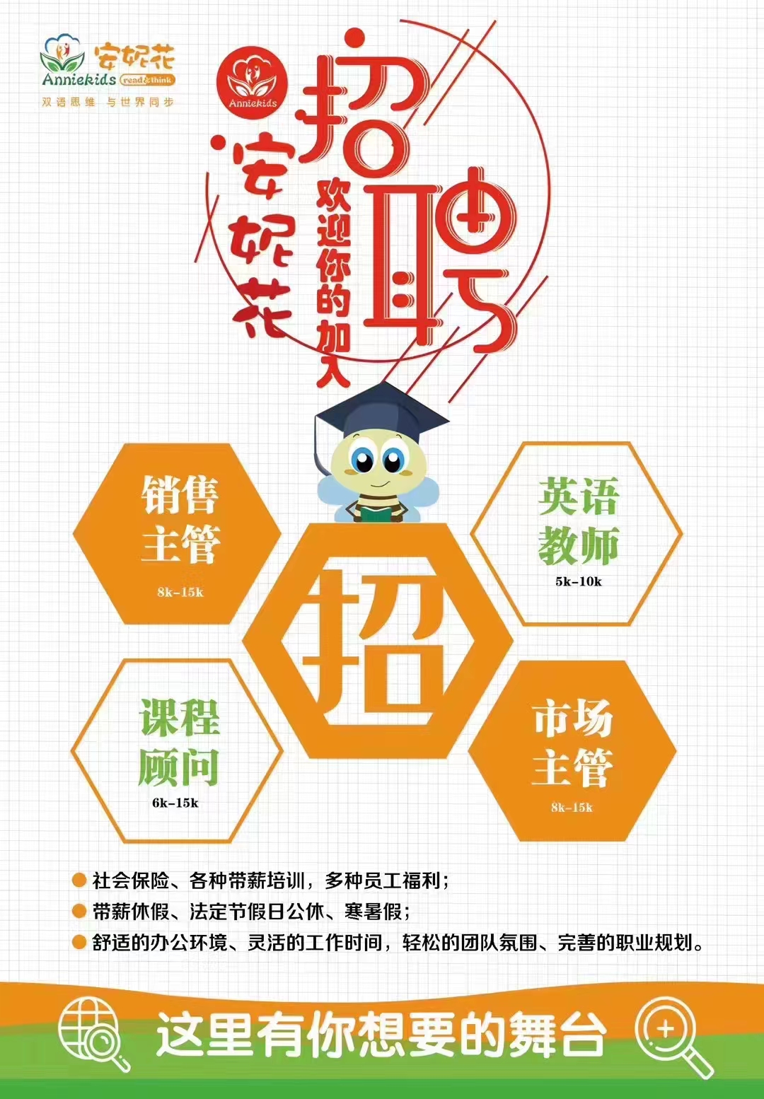 安妮花少儿英语启蒙馆因扩张,需要招聘以下岗位: