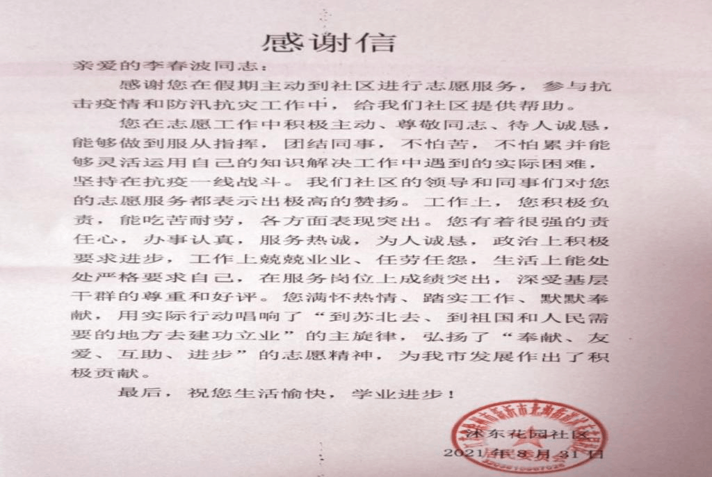 (李春波同学收到沭东花园社区的感谢信)