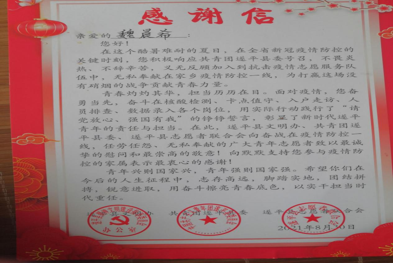 (魏晨希同学收到县城的感谢信)