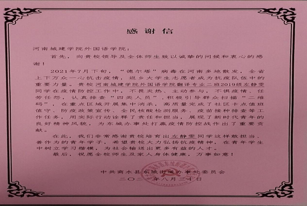 (通讯员 于瑞雪 孙巾奥)这个暑假,对于河南省来说是不平凡的,疫情叠加汛情。我院学子利用暑假,积极参与当地防疫抗洪志愿者服务,为家乡做出自己的贡献,用担当书写了最美芳华。一封封感谢信不仅是对我院教育事业的肯定,更彰显了我院学子无私奉献,勇于担当的优秀品质。