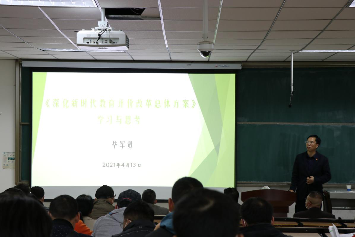 (通讯员:王莉)4月13日下午,我院联合艺术设计学院、国际教育学院、体育教学部邀请合作与发展规划处处长毕军贤在一号楼326教室为四个教学院部全体教师做《深化新时代教育评价改革总体方案》解读宣讲,会议由外国语学院党委书记王东旭主持。