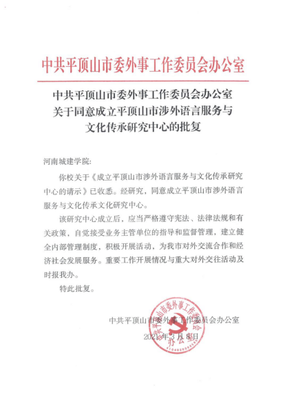 (通讯员 张湘雨)近日,我院申报的“平顶山市涉外语言服务与文化传承研究中心”获中共平顶山市委外事工作委员会办公室批复,标志着我院科研平台建设和服务地方能力取得新进展。