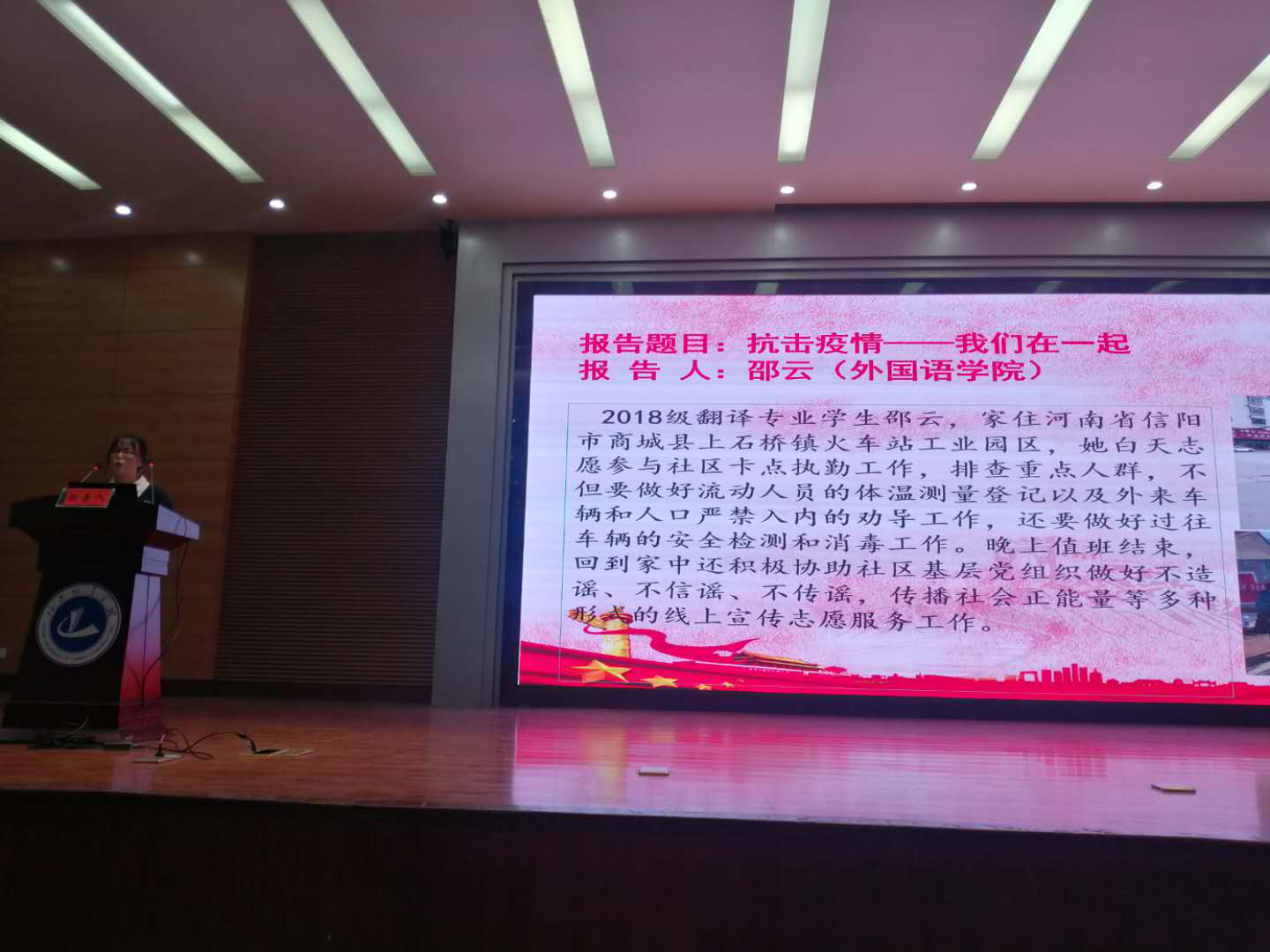 邵云,是2018级翻译专业的一名学生,也是欧美精品一区二区青年志愿者协会的会长。她用亲身经历和切实感受向同学们证明了,新时代的大学生生逢其时,肩负重任,要志存高远,脚踏实地,不畏艰难险阻,勇挑时代使命!