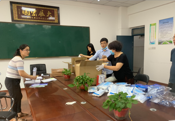 (党总支书记袁晓带领分装报到防疫物品)
