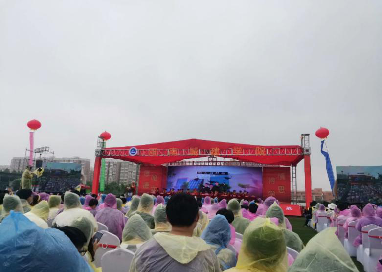 (学生冒雨参加学校毕业典礼)