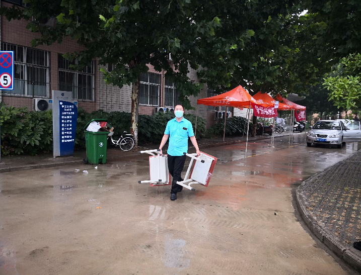 (院党总支副书记张换成冒雨搬运报到桌椅)