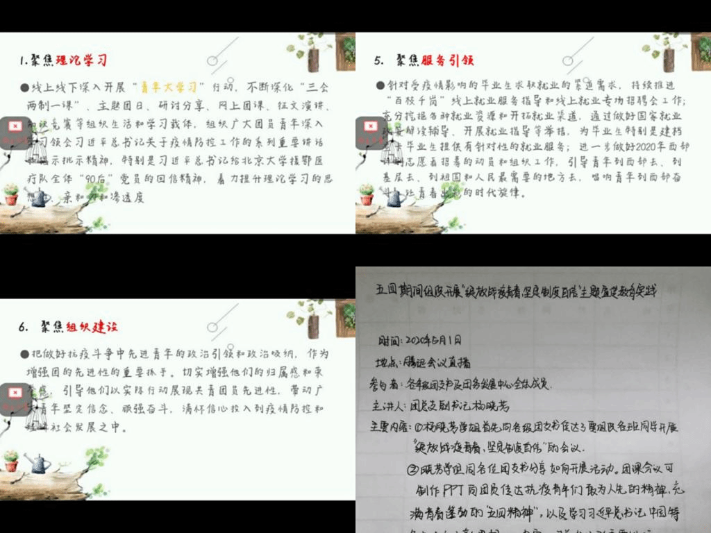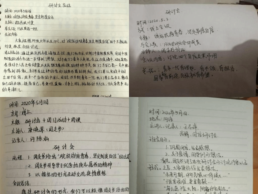 活动以线上的方式召开,通过组织主题团日、团课、研讨会、征文演讲等活动强化团员青年们对回信精神的理解。其次,组织疫情期间参与抗疫志愿服务的青年团员们分享了他们在疫情防控中的感人事迹,并通过座谈交流、研讨会让同学们感受到了青年优秀志愿者们乐于奉献的精神品格,为广大青年团员树立了榜样,激励其向青年先锋看齐,把对他们的敬佩和内心的感动化作奋斗的动力,顽强拼搏勤学上进。最后还开展了毕业班就业情况调查,了解了毕业生目前最关心的就业问题,以期能更好地针对毕业生就业问题给予解答,为毕业生的就业提供更多的有针对性的指导和帮助。
