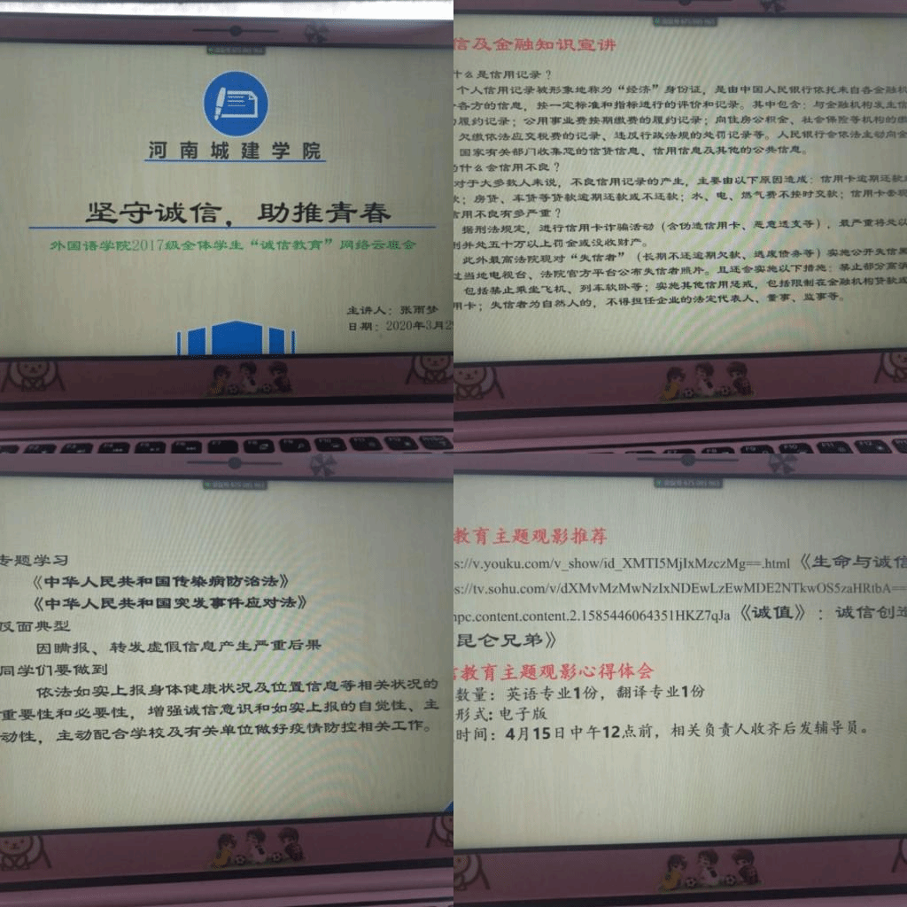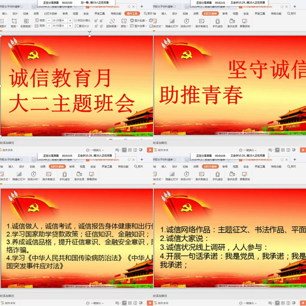 首先,各年级辅导员强调诚信的重要性并通过分享本次疫情中涌现出的诚信故事,理论宣讲,案例分析,在线问答等形式,提高同学们的诚信意识,金融安全意识,防范网络诈骗意识。第二,向同学们宣讲相关法律法规,分析在本次疫情中出现瞒报,传播虚假信息,产生严重后果的反面典型带来的巨大危害,引导同学们树立诚信意识。第三,同学们以网络为载体积极讨论,分享自己关于“诚信”的新的认识,使大学生充分认识依法如实上报身体健康状况及位置信息等相关状况的重要性和必要性,增强诚信意识和如实上报的自觉性、主动性,主动配合学校及有关单位做好疫情防控相关工作。
