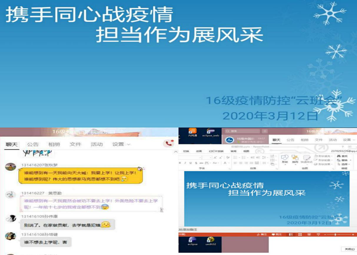 大二辅导员赵星辰老师通过qq群召开“云班会”,他从国内疫情基本得到控制和国外疫情迅猛发展的基本事实给同学们讲述中国特色社会主义制度集中力量办大事的优越性,并结合具体事例和现象给同学们分析了疫情防控阻击战中“中国方案”给世界疫情的贡献,主要包括中国高度、中国广度、中国速度、中国温度四个方面。他向同学们强调了学校疫情防控期间的纪律要求:严格遵守纪律,绝不提前返校;外出计划先请示后行动;每天学工系统APP和省厅系统报平安,一个都不能少;如果身体出现感冒、发烧、咳嗽等任何异常症状及时报告给辅导员;按时上好每一节网络课,要求全体学生遵守疫情防控期间学校的纪律要求。