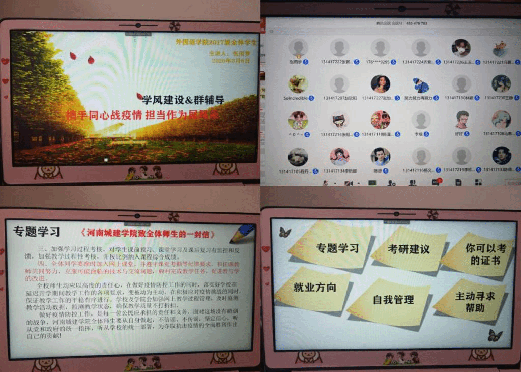 大三辅导员张雨梦通过腾讯会议召开“云班会”,班会的内容主要包括:专题学习、考研建议、必考证书、就业方向、自我管理、主动寻求帮助六大方面,指导同学们在家学会弯道超车,确定自己的就业和考研目标,并及时向大四优秀的学姐学长咨询请教,利用居家时间做好自己的学业和职业生涯规划,要求全体学生遵守疫情防控期间学校的纪律要求。