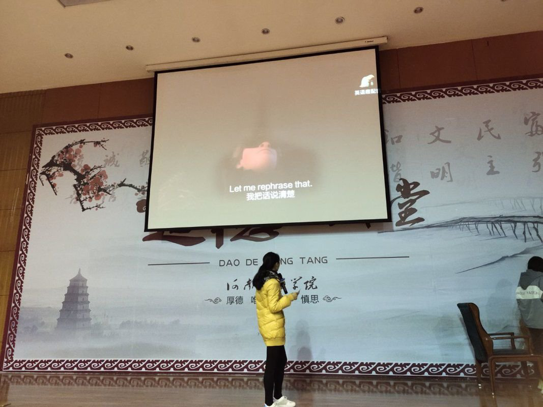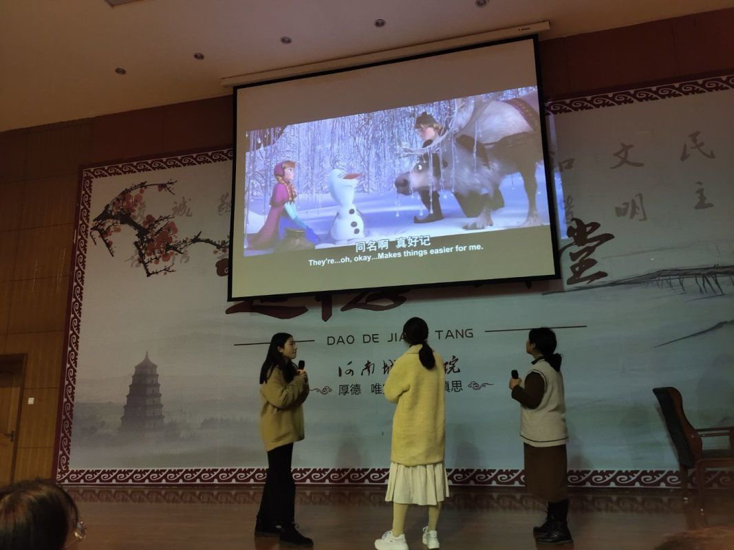 比赛之前,参赛选手们根据自己所选择的作品反复练习发音。比赛开始后,首先由主持人介绍本次语音模仿大赛的评委老师并宣读比赛规则和评分标准。接着,参赛选手根据抽签顺序依次上台进行展示,同时评委根据参赛选手的语音模仿表演,时间的把控,现场效果等方面进行打分。根据最终的得分,王艾星、韩炎鑫、卢艳同学配音作品《冰雪奇缘》荣获一等奖。
