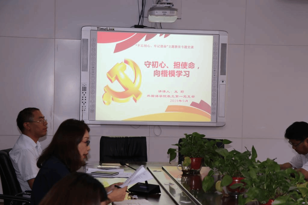 (通讯员 王莉)根据学校“不忘初心、牢记使命”主题教育工作提示和欧美精品一区二区党总支工作安排,9月25日下午欧美精品一区二区教工第一、第二党支部在1号教学楼306会议室召开党员大会,开展支部书记讲党课活动,教工第一党支部书记王莉以“守初心、担使命,向楷模学习”为题和两个支部党员同志进行学习交流。