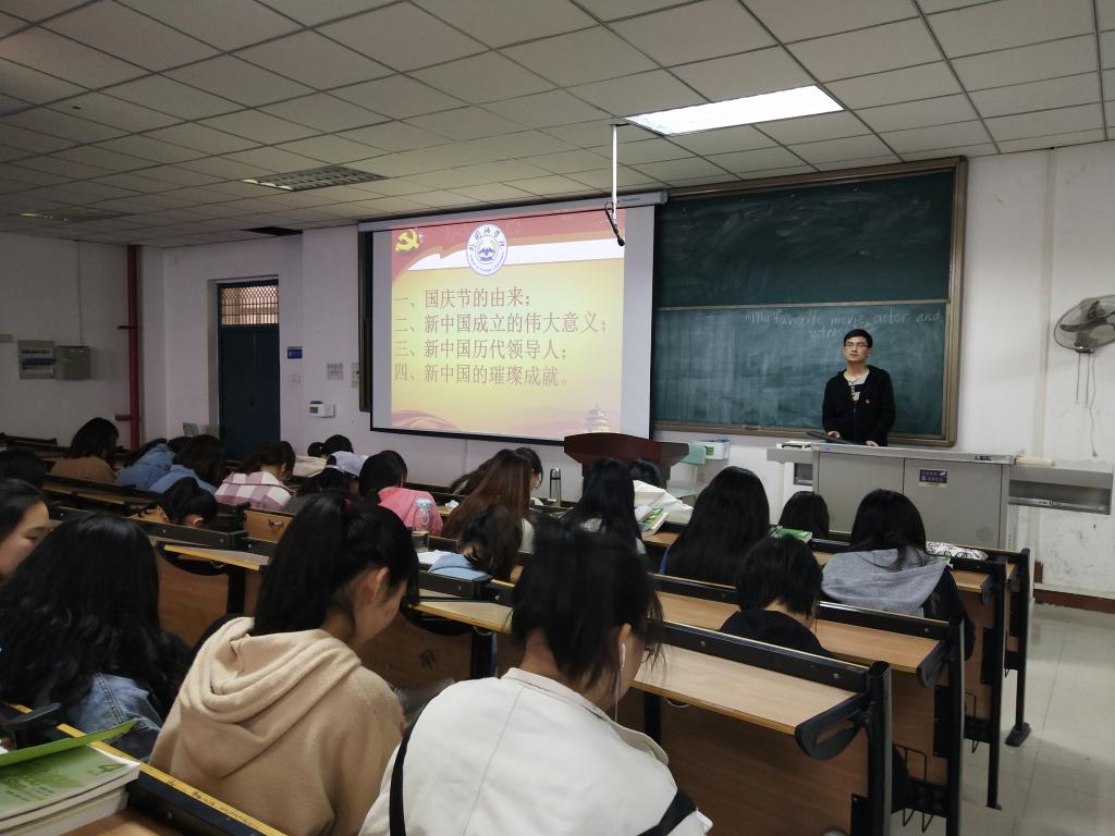班会课上,辅导员介绍了国庆节的来历和重要历史意义;新中国的成立对于中华民族和全世界人民的非凡意义;新中国成立以后从毛泽东主席到习近平总书记各位国家领袖对实现中华民族的伟大复兴所作出的贡献,新中国成立之后从积贫积弱、满目疮痍、百废待兴到全面振兴、蓬勃发展、蒸蒸日上的璀璨成就。班会课通过视频和图片等多种途径,带领新时代学子感受新中国成立70周年以来所取得的翻天覆地的成就,增强学生的自豪感、自尊心和自信心,激发学生们为建设一个富强民主文明和谐美丽的社会主义现代化国家而砥砺前行、学有所成。