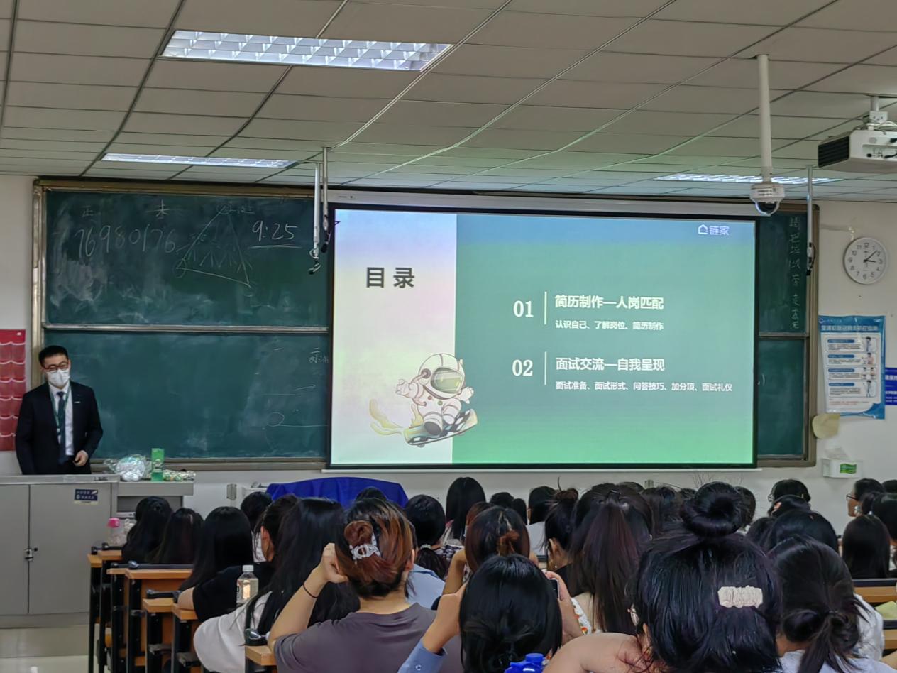 (张湘雨)9月21日下午,欧美精品一区二区邀请上海链家刘倩和徐家伟两位讲师于1#428教室为2023届毕业生举办简历制作与面试技巧公益讲座,外国语学院就业指导老师张湘雨和2023届全体毕业生参加。