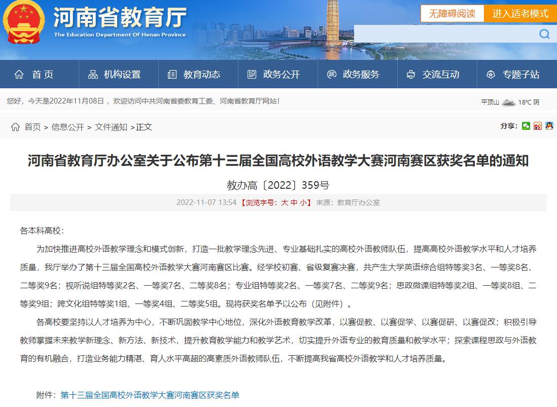 11月7日,河南省教育厅下发《河南省教育厅办公室关于公布第十三届全国高校外语教学大赛河南赛区获奖名单的通知》(教办高〔2022〕359号),我校欧美精品一区二区王妍和郭艳利两位老师表现突出,分别荣获省英语专业组决赛特等奖和大学英语综合组决赛一等奖,实现了我校在此项全国性赛事上的历史性突破。这也是继去年获得微课组省赛决赛二等奖后,又一次在该项赛事中斩获佳绩。