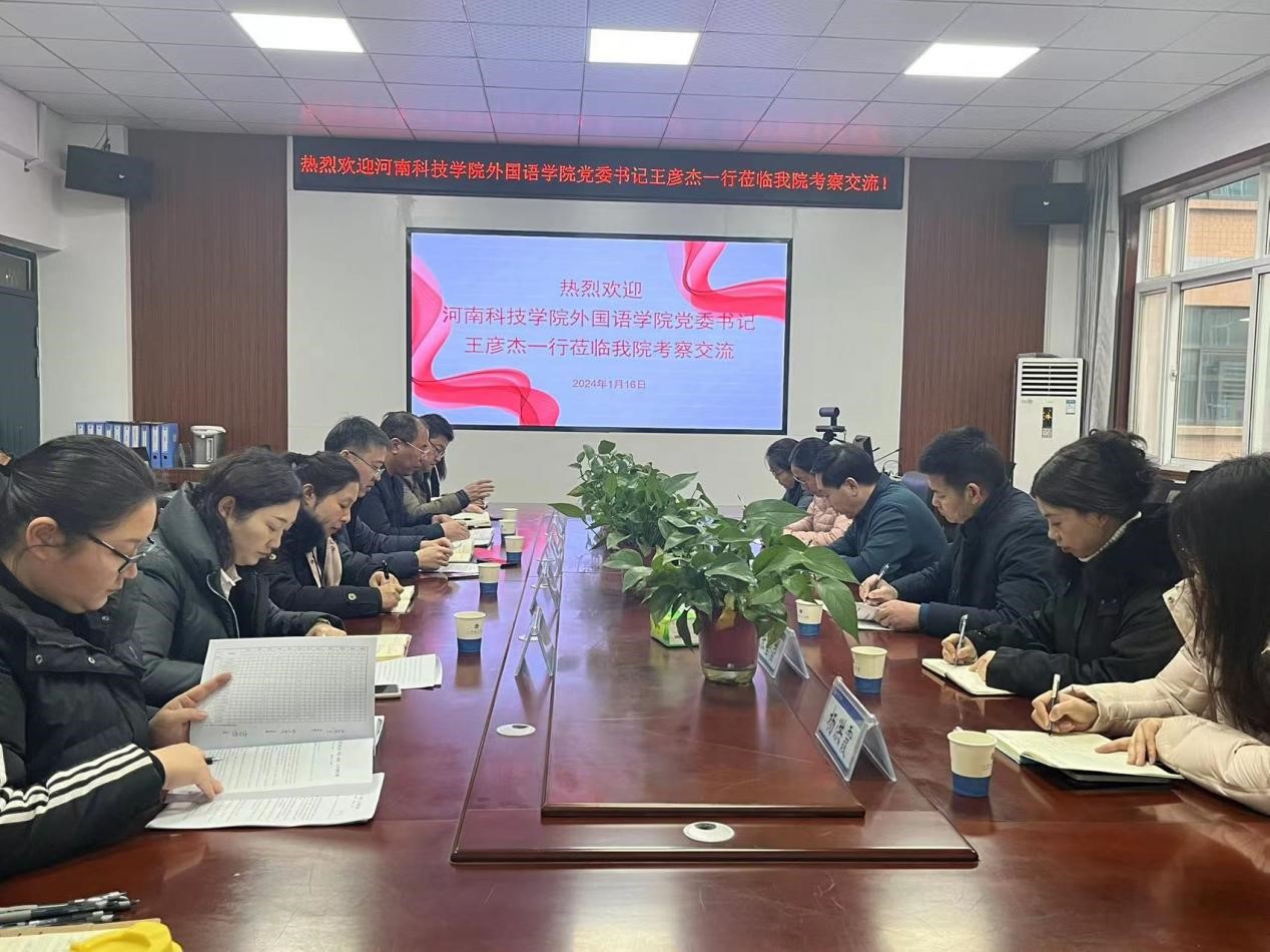 (通讯员 张湘雨)1月16日上午,河南科技学院欧美精品一区二区党委书记王彦杰、副院长万文龙、就业专员张超清、科研秘书马艳芳、教师张莹莹、辅导员杨洪霞一行来我院交流。欧美精品一区二区党委书记王东旭、院长张换成、副书记张金俊、副院长秦小锋、副院长张凤琴及教务办、学工办、科研与校企合作办相关负责人和翻译系主任参加交流。会议由王东旭主持。