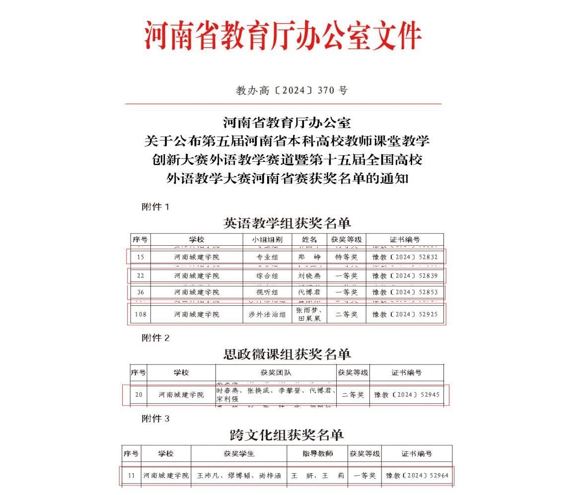 近日,河南省教育厅下发《河南省教育厅办公室关于公布第五届河南省本科高校教师课堂教学创新大赛外语教学赛道暨第十五届全国高校外语教学大赛河南省赛获奖名单的通知》(教办高〔2024〕370号),我校欧美精品一区二区教师在全部三个组别的比赛中,成绩突出,成果丰硕,首次实现各组别奖项大满贯,荣获特等奖1项,一等奖3项,二等奖2项,充分展示了我校外语教师的教学水平。其中,郑峥获英语教学组专业组决赛特等奖;代博君、刘晓燕、王妍分别获视听组、综合组、跨文化组决赛一等奖;张雨梦团队和时春燕团队获涉外法制组、思政微课组决赛二等奖;