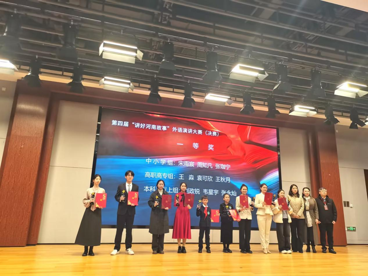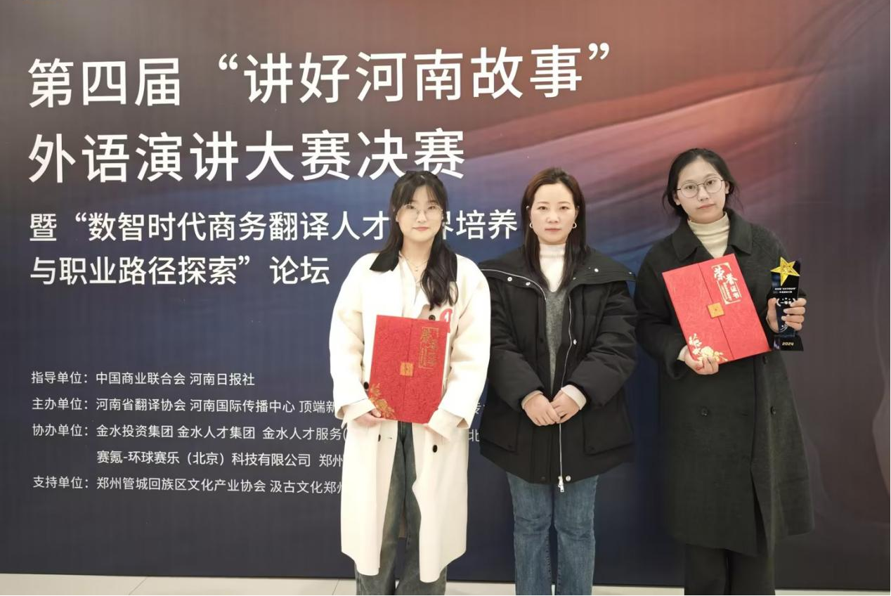 第四届“讲好河南故事”外语演讲大赛由河南国际传播中心和河南省翻译协会等联合举办,初赛和复赛阶段吸引了1000多名选手。本科及以上组决赛设置特等奖 1 名、一等奖 3 名、二等奖 6 名,三等奖 15名。我校2名学生在指导教师的精心指导下,历经三轮激烈角逐,凭借其深入的主题剖析,流利的英语表达和真挚的情感,将河南的汝瓷和钧瓷故事娓娓道来,展示了良好的外语表达能力和对河南文化的热爱与传承,喜获佳绩。